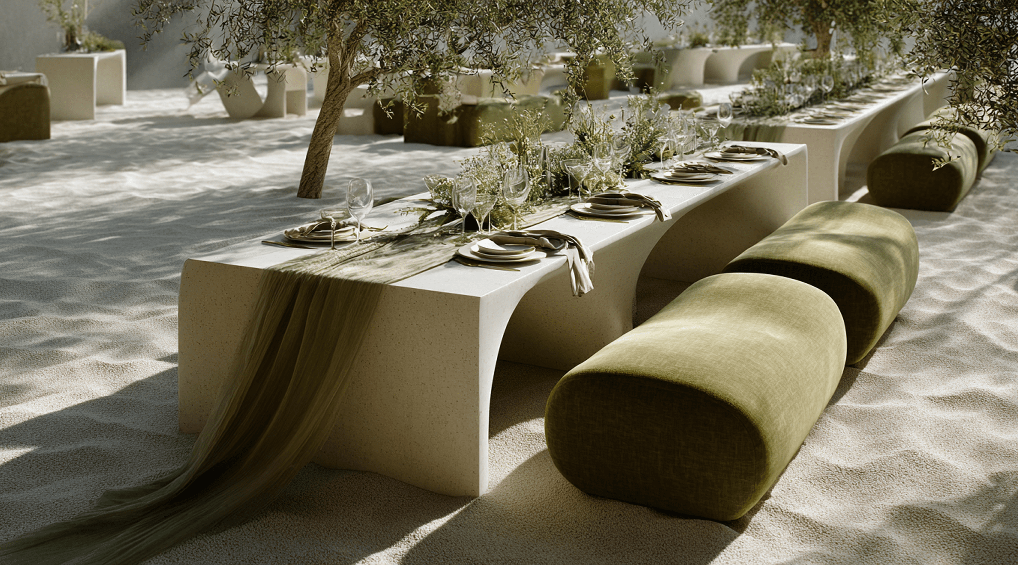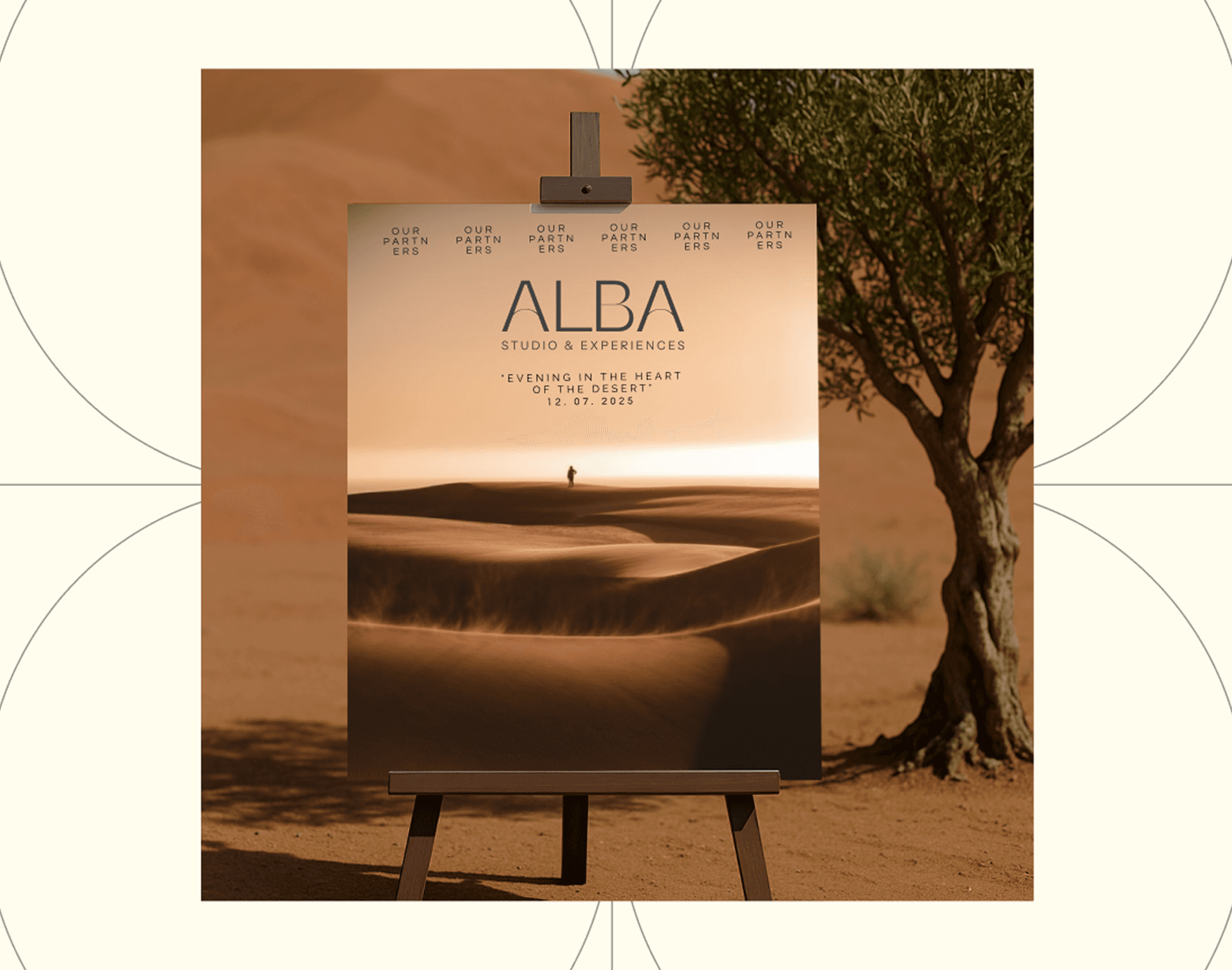 We built the identity from the ground up - logo, type, palette, visual language. The direction was guided by the worlds Alba operates in: desert textures, warm metallics, flowing forms. AI-generated visuals helped us establish the brand's aesthetic before a single event was photographed under the new identity.