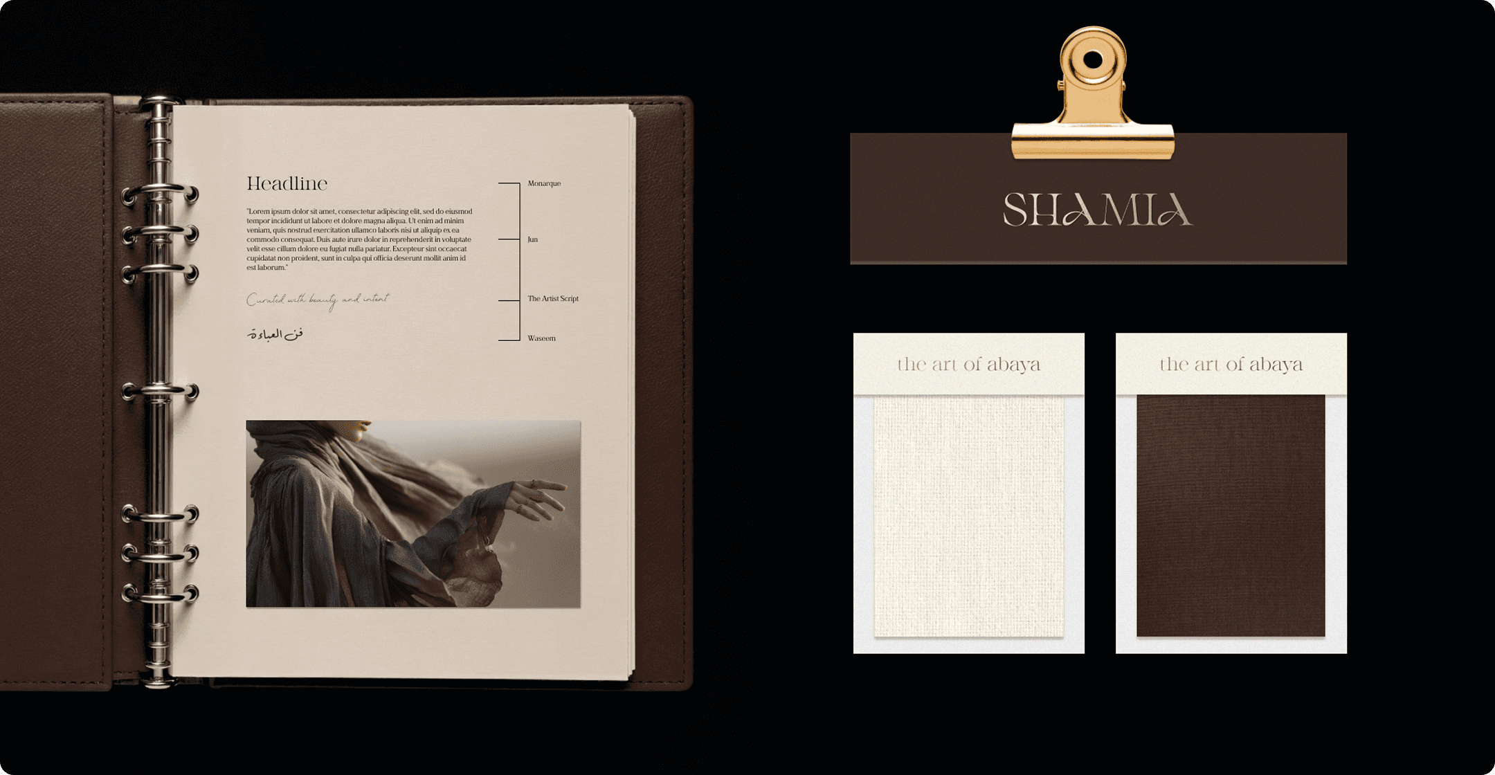 We built Shamia's brand identity, packaging, Shopify store, and AI-generated campaign visuals - everything a new abaya label needs to launch with presence.