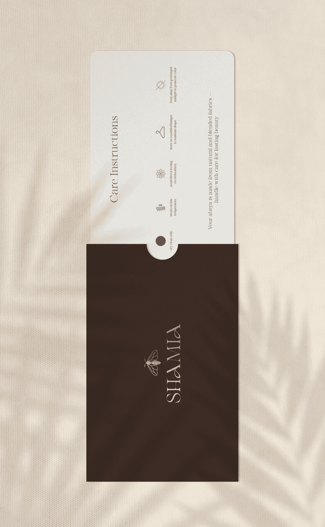 Shamia's packaging had to do more than protect the product. It had to set expectations. We designed printed inserts, care cards, branded envelopes, and garment tags that carry the same restraint and warmth as the brand identity.