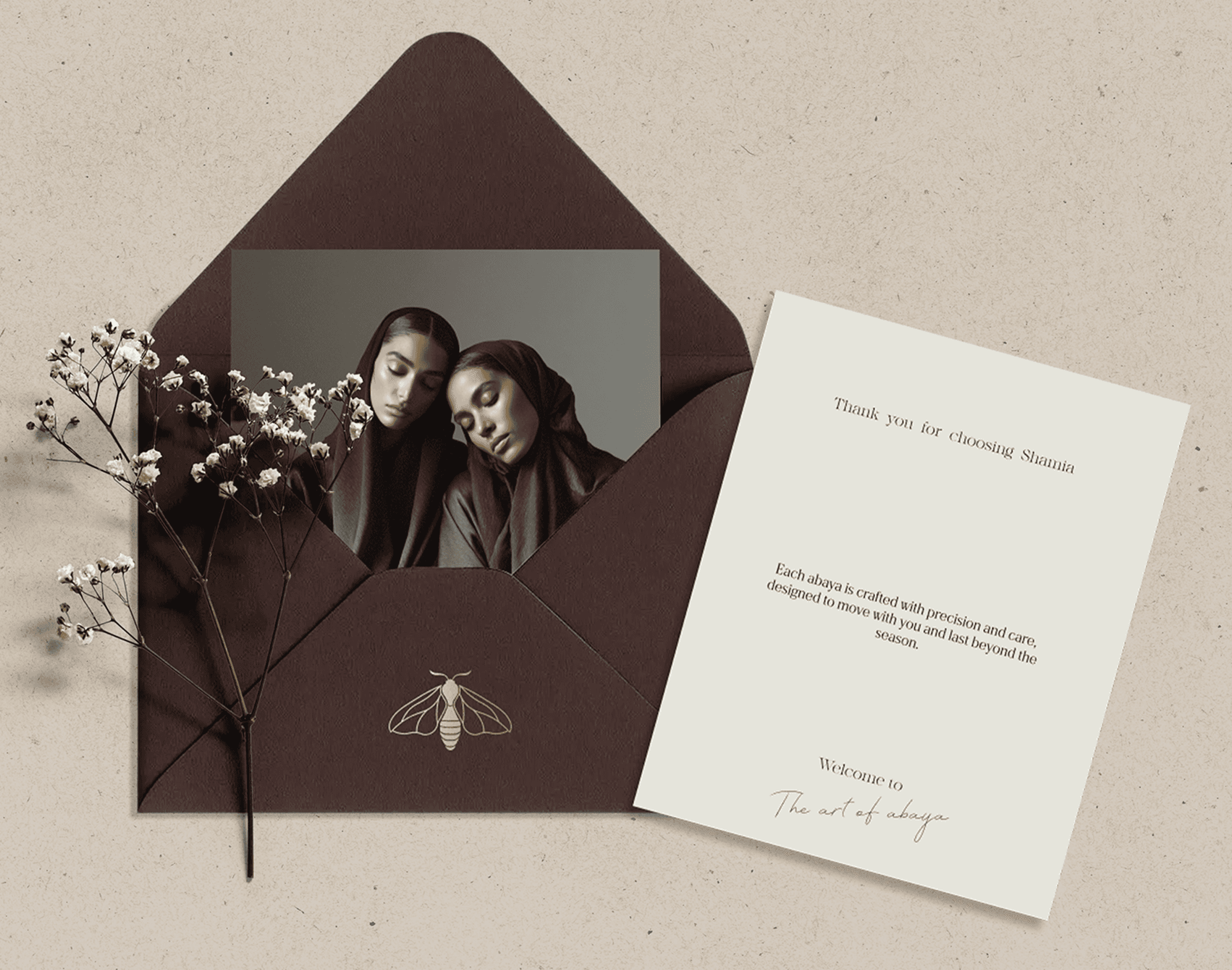 Every material was chosen to feel right in the hand - textured paper, matte finishes, gold foil used sparingly. The kind of details that make a customer photograph the unboxing before they try on the abaya.